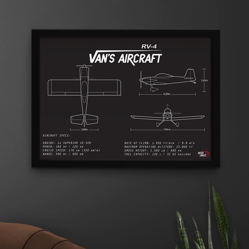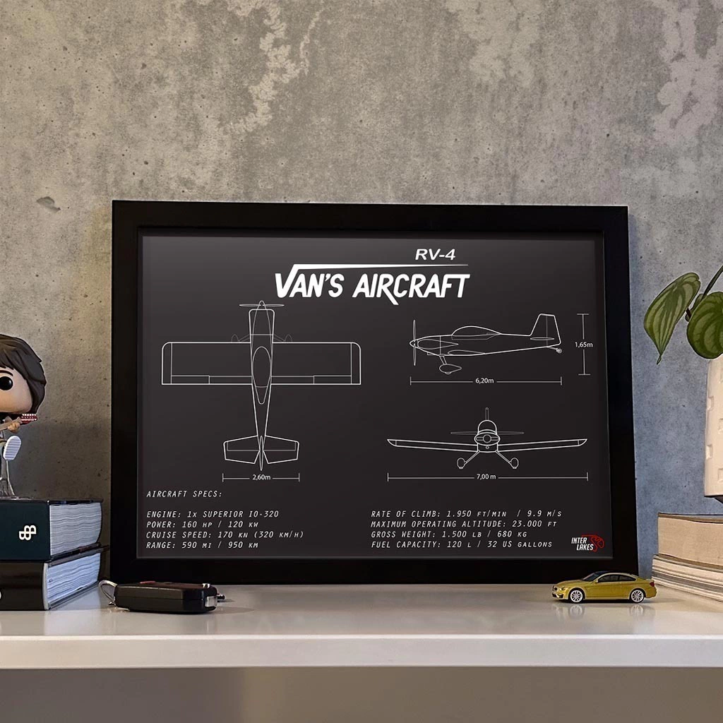 Traga o VANS RV-4 para fazer parte da decoração da sua casa, seja ele uma parte da sua história, esteja no hangar ou ainda exista apenas nos seus sonhos. Eternize a máquina que faz seu coração bater mais forte com um quadro decorativo exclusivo da Interlakes. Este quadro no ESTILO PRETO E BRANCO apresenta uma blueprint detalhada com as visões lateral, frontal e traseira (front view, side view, rear view), permitindo que você transforme seu lar em um verdadeiro templo para suas paixões aéreas. Adquira agora esta impressionante arte do VANS RV-4 e eleve o estilo do seu ambiente.