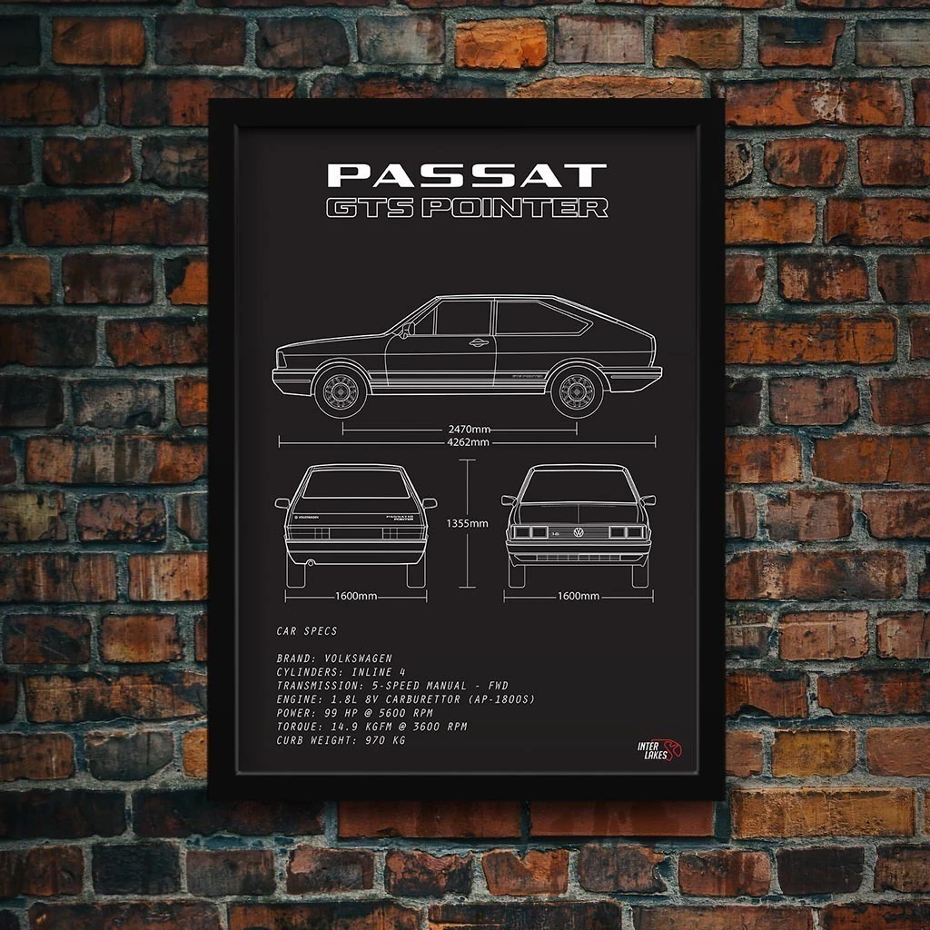 Traga o VOLKSWAGEN PASSAT POINTER GTS para fazer parte da decoração da sua casa, seja ele uma parte da sua história, esteja na garagem ou ainda exista apenas nos seus sonhos. Eternize a máquina que faz seu coração bater mais forte com um quadro decorativo exclusivo da Interlakes. Este quadro no ESTILO PRETO E BRANCO apresenta uma blueprint/desenho técnico detalhado com as visões lateral, frontal e traseira (front view, side view, rear view) com ficha técnica das especificações do veículo, permitindo que você transforme seu lar em um verdadeiro templo para suas paixões automotivas. Adquira agora esta impressionante arte do VOLKSWAGEN PASSAT POINTER GTS e eleve o estilo do seu ambiente.