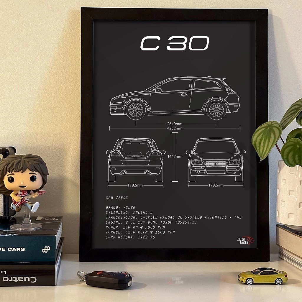Traga o VOLVO C30 T5 2008 para fazer parte da decoração da sua casa, seja ele uma parte da sua história, esteja na garagem ou ainda exista apenas nos seus sonhos. Eternize a máquina que faz seu coração bater mais forte com um quadro decorativo exclusivo da Interlakes. Este quadro no ESTILO PRETO E BRANCO apresenta uma blueprint/desenho técnico detalhado com as visões lateral, frontal e traseira (front view, side view, rear view) com ficha técnica das especificações do veículo, permitindo que você transforme seu lar em um verdadeiro templo para suas paixões automotivas. Adquira agora esta impressionante arte do VOLVO C30 T5 2008 e eleve o estilo do seu ambiente.