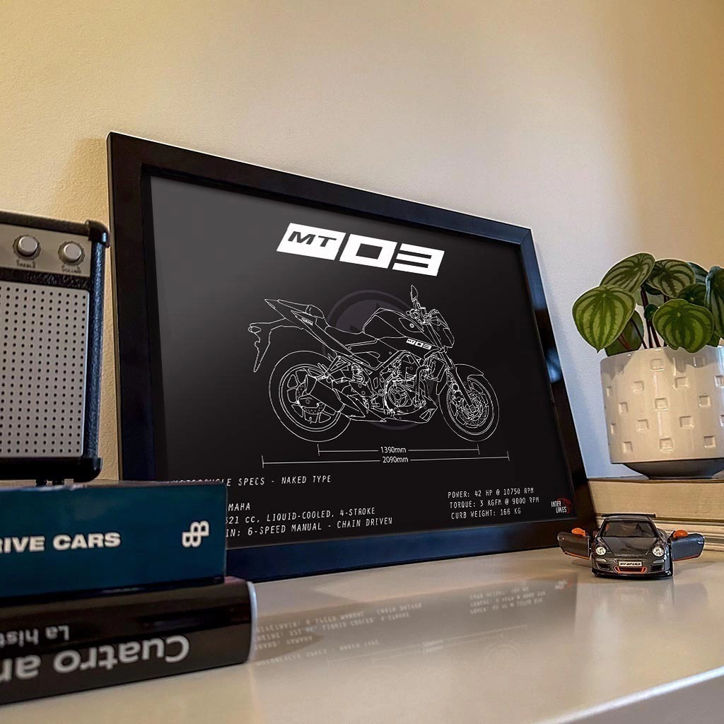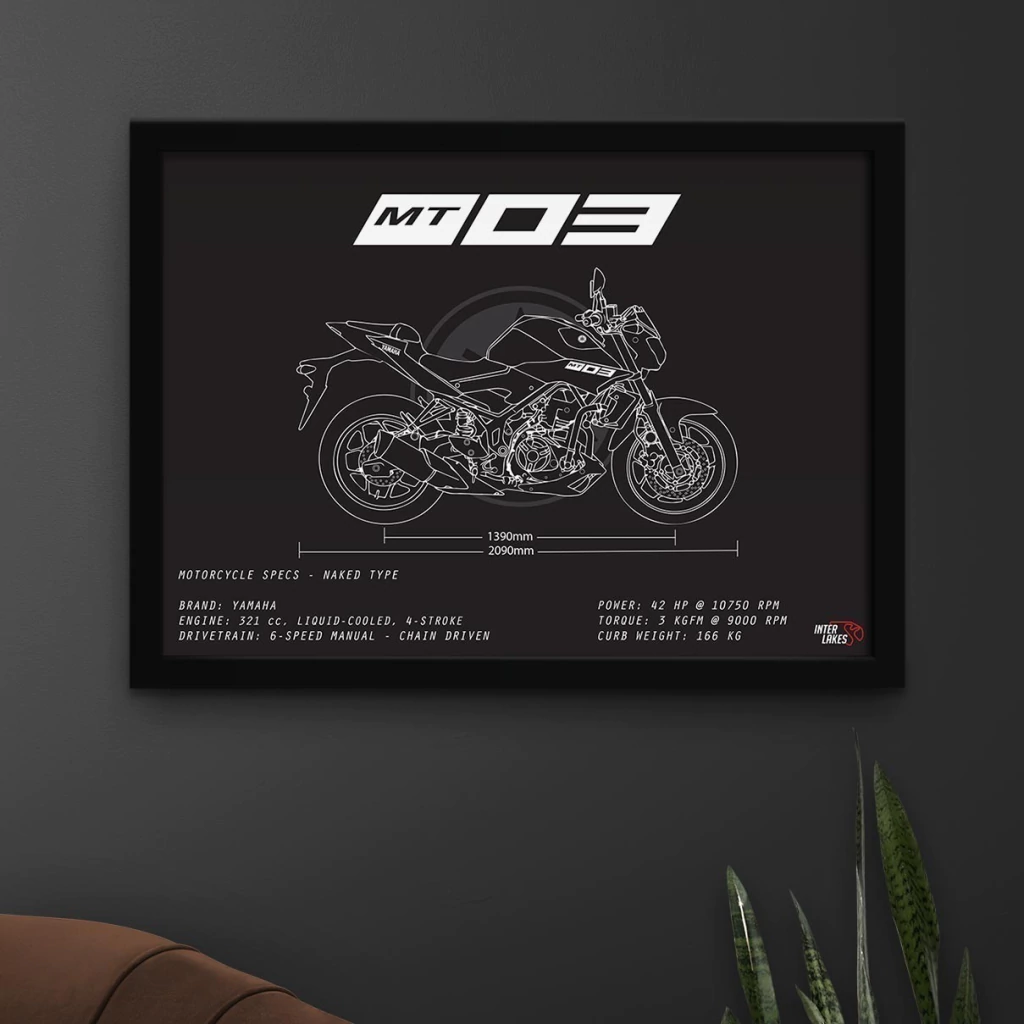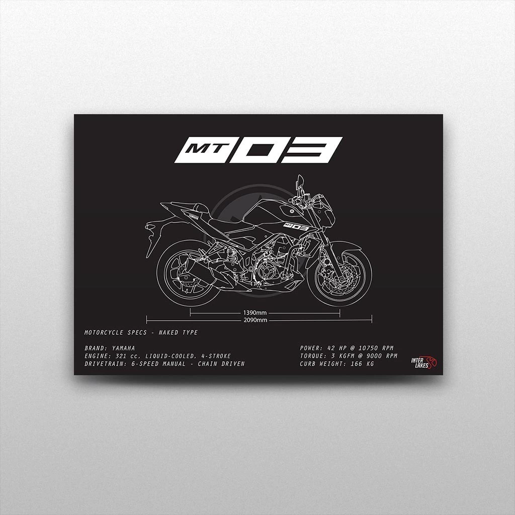 Traga o YAMAHA MT-03 2019 para fazer parte da decoração da sua casa, seja ele uma parte da sua história, esteja na sua garagem ou ainda exista apenas nos seus sonhos. Eternize a máquina que faz seu coração bater mais forte com um quadro decorativo exclusivo da Interlakes. Este quadro no ESTILO PRETO E BRANCO apresenta uma blueprint/desenho técnico detalhado com as visões lateral, frontal e traseira (front view, side view, rear view) com ficha técnica das especificações do veículo, permitindo que você transforme seu lar em um verdadeiro templo para suas paixões em duas rodas. Adquira agora esta impressionante arte do YAMAHA MT-03 2019 e eleve o estilo do seu ambiente.