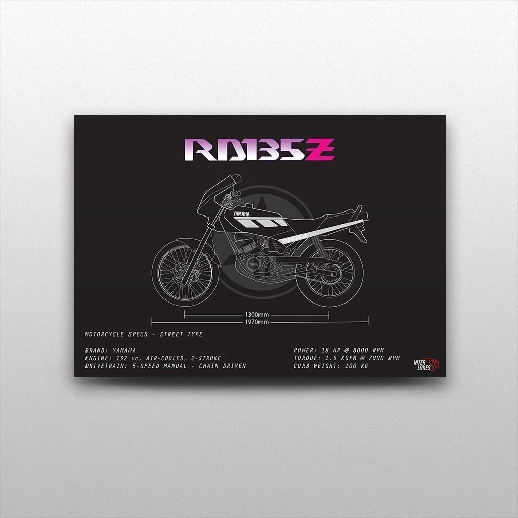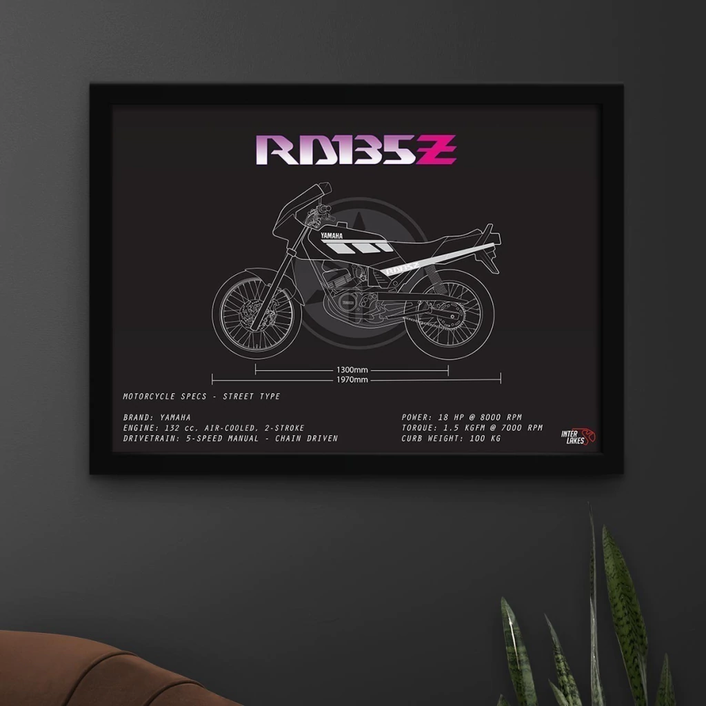 Traga o YAMAHA RD 135Z para fazer parte da decoração da sua casa, seja ele uma parte da sua história, esteja na sua garagem ou ainda exista apenas nos seus sonhos. Eternize a máquina que faz seu coração bater mais forte com um quadro decorativo exclusivo da Interlakes. Este quadro no ESTILO PRETO E BRANCO apresenta uma blueprint/desenho técnico detalhado com as visões lateral, frontal e traseira (front view, side view, rear view) com ficha técnica das especificações do veículo, permitindo que você transforme seu lar em um verdadeiro templo para suas paixões em duas rodas. Adquira agora esta impressionante arte do YAMAHA RD 135Z e eleve o estilo do seu ambiente.